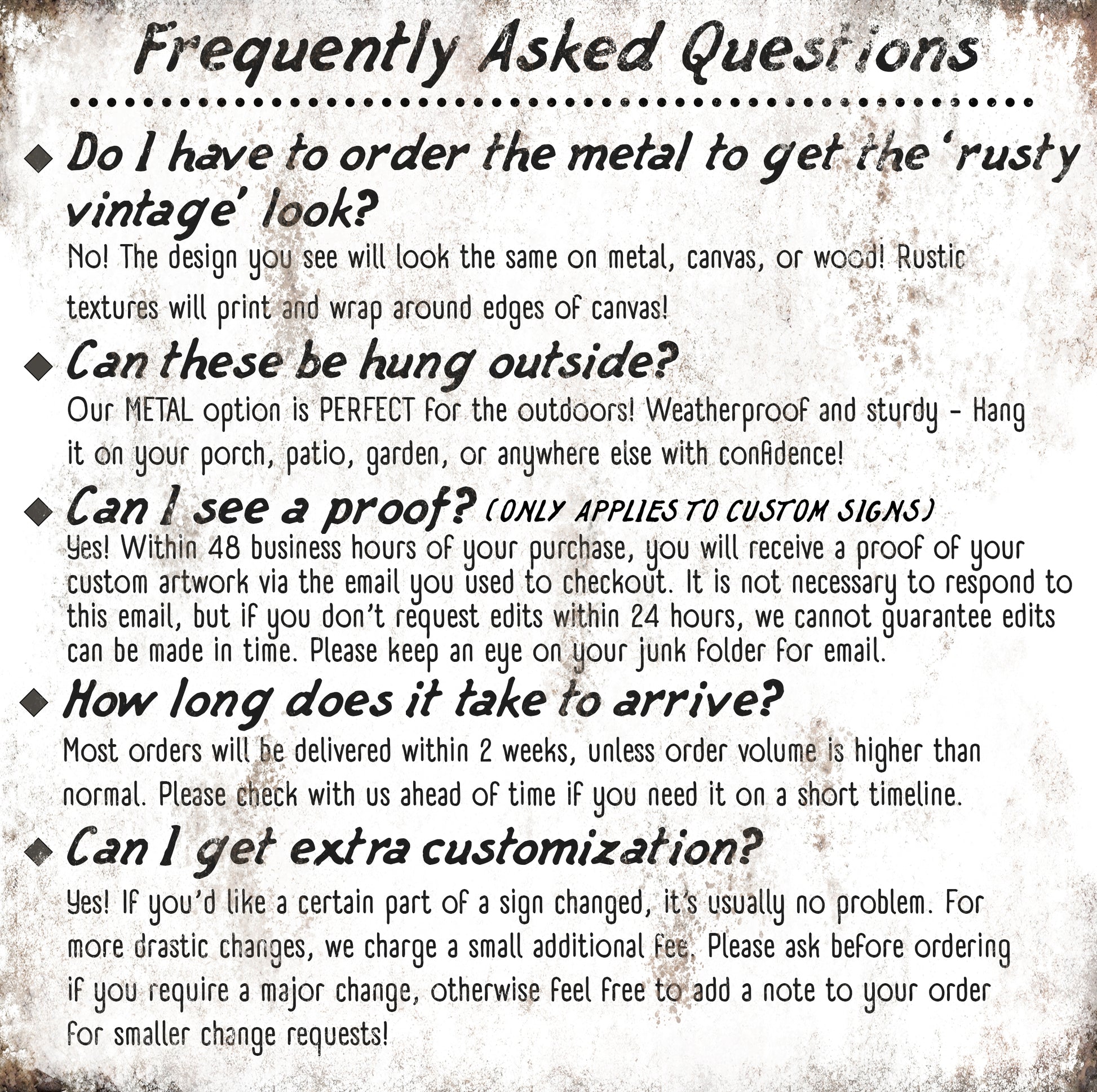 ➡️ The rustic and weathered textures you see in the artwork will look the same no matter what item you order on. That means metal, wood, and canvas all have the vintage look to them!